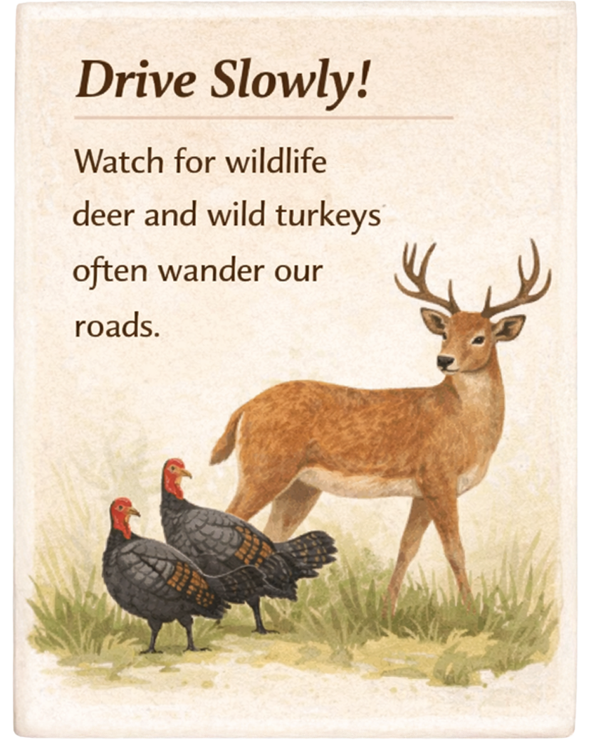 Our land is home to plenty of wildlife. Near our pond you will see frogs, and turtles. Around the grapes, and wood lines you will see deer, tiny red or gray foxes and even wild turkeys. They roam freely and occasionally take their time crossing the road. They’re beautiful to watch, just admire them from a distance.