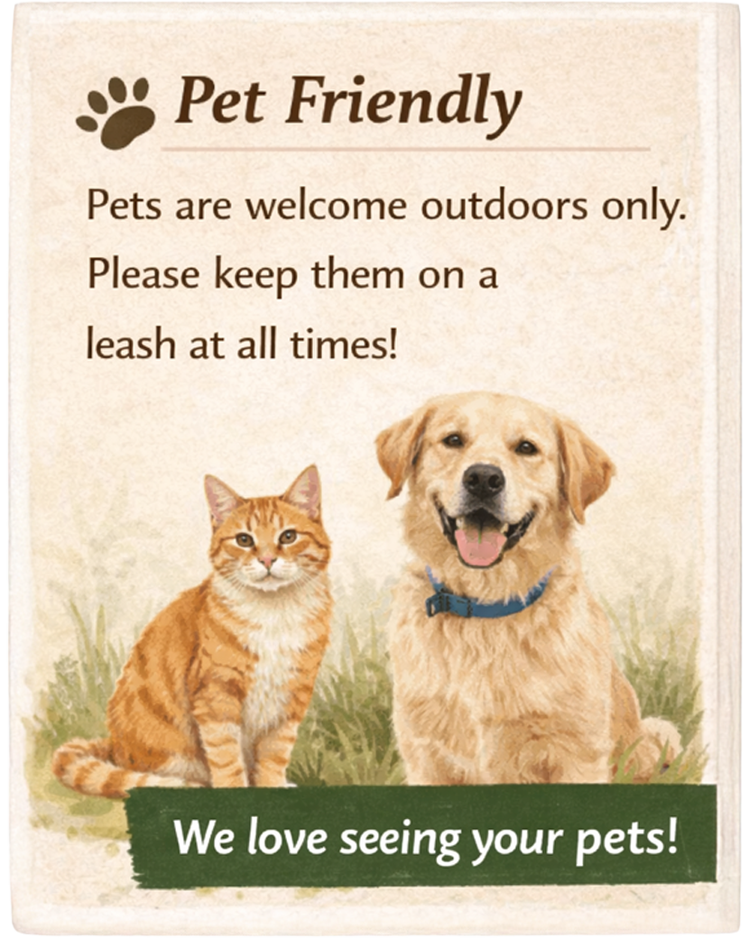 If your pet prefers a quieter environment, please remember our vineyard is a popular gathering place for fellow animal lovers.