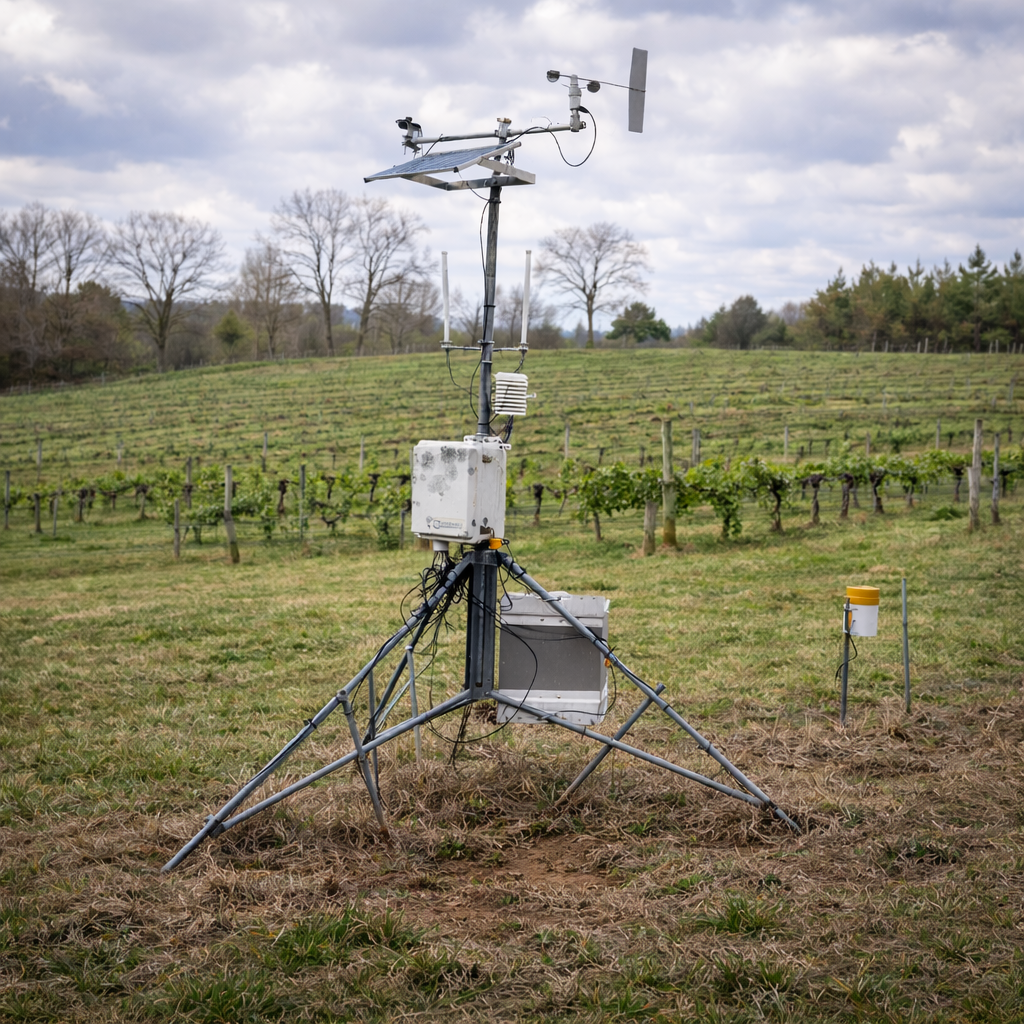 High in the foothills of the North Georgia mountains, Three Sisters Vineyards sits within the Dahlonega Plateau AVA, a region known for its unique combination of elevation, mountain airflow, and mineral-rich soils. To better understand the climate that shapes each vintage, Three Sisters hosts a University of Georgia agricultural weather station directly on the vineyard property. This station is part of the Georgia Automated Environmental Monitoring Network (AEMN), a statewide system that collects precise weather data used by farmers, researchers, and agricultural specialists throughout Georgia. Because the station sits here on the vineyard, the data reflects the actual conditions experienced by our vines each day of the growing season.
